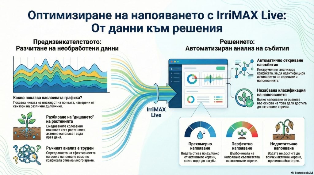 В подробна публикация на sinor.bg е представено как IrriMAX™ Live обработва и визуализира данните от почвените сонди Drill & Drop, както и как системата подпомага вземането на точни агрономически решения, доказани в реални стопанства.