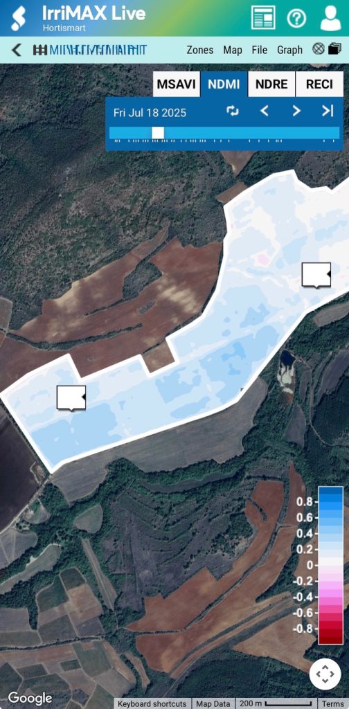 растителността, предоставяйки информация за наличието на влага в почвата. Когато се комбинира с данни от сензори, NDMI може да помогне за оптимизиране на напояването, намалявайки разходите за вода.