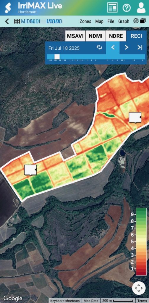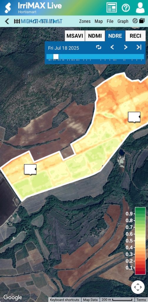 - сателитни изображения с индекси NDVI, NDMI, NDRE, MSAVI и RECI: