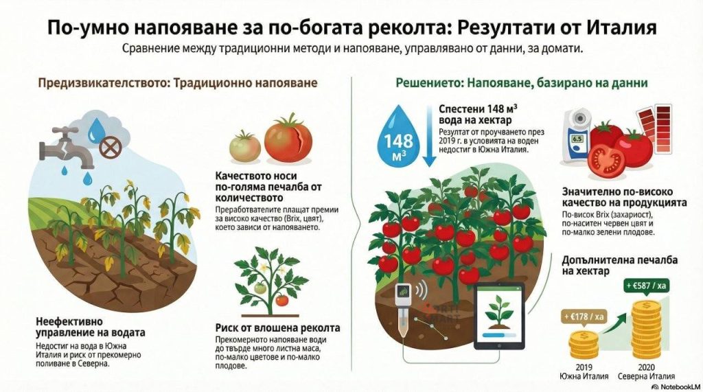 С Irrimax Live и сондите на Sentek фермерите получават реални, измерими резултати за икономия на вода и оптимизация на напояването. Примери от Италия и други страни показват, че този подход е не само теоретичен, а приложим и ефективен в разнообразни земеделски условия и култури, включително домати, ягоди, круши, люцерна, царевица и много др.: