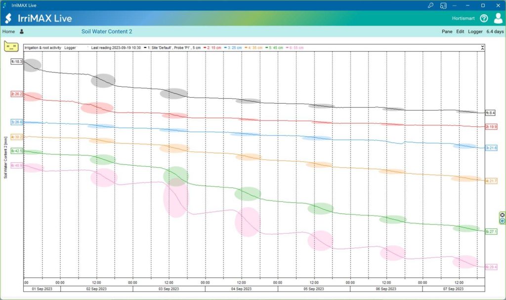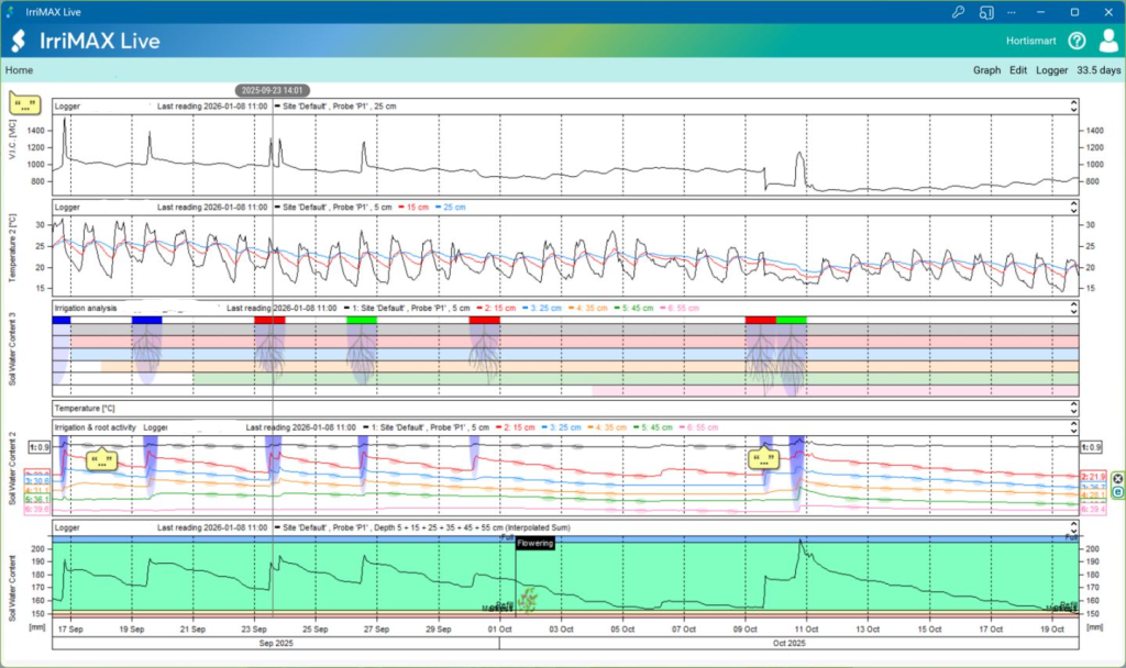 - Irrimax Live разполага с инструменти като откриване на събития – дъжд, поливки и други, както и на инструменти за откриване на активност на корените и движение на торовете по дълбочина в почвата;